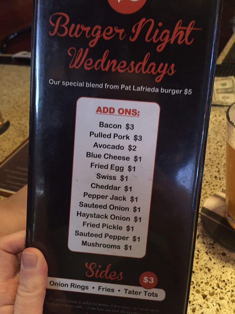 Prime beef burger served with fries, lettuce and tomato Make it a cheeseburger and/ or bacon burger! See our additions!
